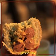 Ingredientes: Pão maior, três Linguicinhas Calabresa, molho de panela, repolho, vinagrete, milho, ervilha, catchup, maionese, mostarda, queijo e batata palha.